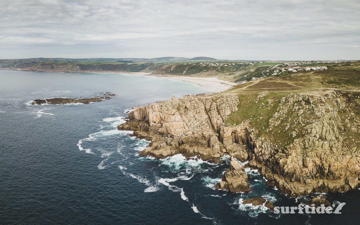 Aerial view of Sennen Cove looking north east. Shot from the headland at Land’s End. You can see the South West Coastal Path and the beaches of Sennen & Gewnver in the distance. Shot using a DJI Mavic Pro Drone.
